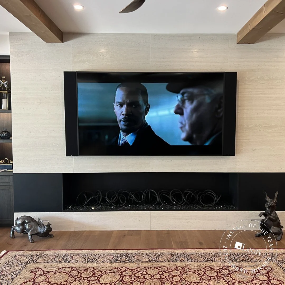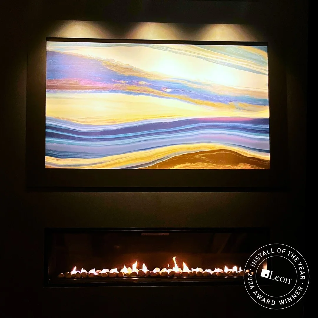 This 10-foot granite feature wall conceals an 83" TV behind a Leon Illusion Moving Art Screen. At the touch of a button, the fireplace turns off, artwork rolls up, and the display lowers into viewing position via a motorized lift—thanks to a custom Leon backbox designed to accommodate the motion and precision required.