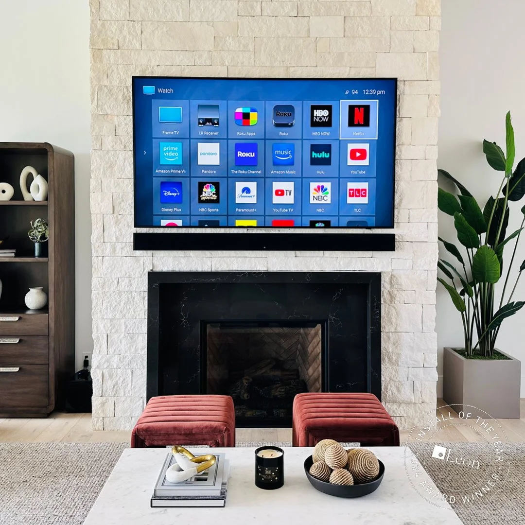 When a designer was hesitant to add a large black TV above the fireplace, Mozaic turned to Leon’s Studio Frame and a custom-fabric TC Bar to create a solution that worked beautifully with the natural stonework and soft palette. The result satisfied both the homeowner’s performance goals and the designer’s aesthetic vision.